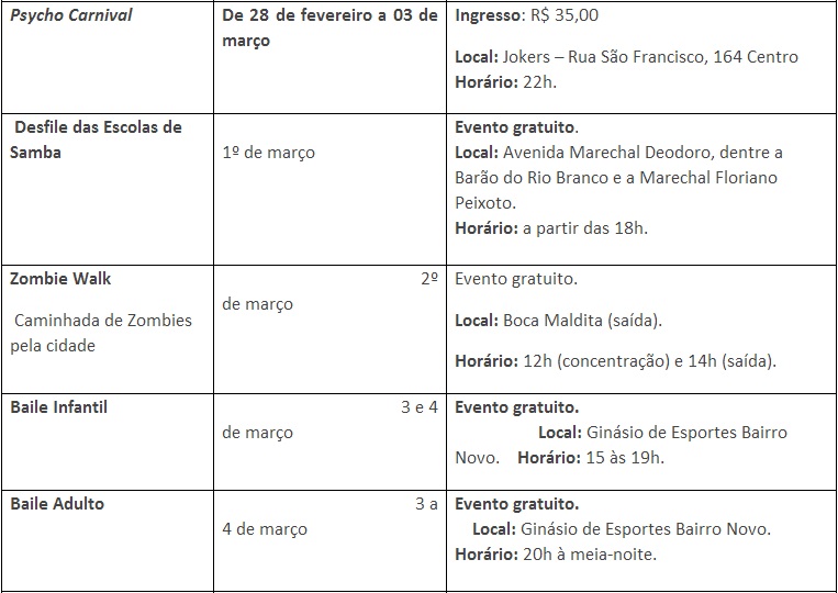 O desfile das escolas de samba acontece no dia 1º de março e voltará a para a Rua Marechal Deodoro, após 16 anos na Avenida Cândido de Abreu, no Centro Cívico. O evento foi transferido a pedido das próprias escolas, pois o espaço é mais adequado e com maior acessibilidade. O Cortejo Real já foi selecionado. Com muito samba no pé, Jonas dos Santos, 23 anos, ganhou a simpatia dos jurados e foi escolhido o Rei Momo da capital. A rainha eleita é Larissa Sancyara de Araujo, 20 anos, passista da escola de samba Acadêmicos da Realeza.