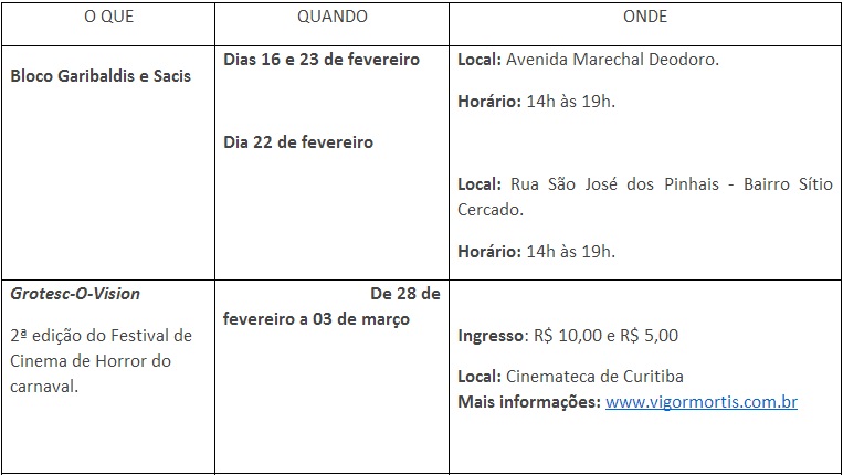 Além do tradicional desfile das escolas de samba, a cidade também sediará o Curitiba Rock Carnival