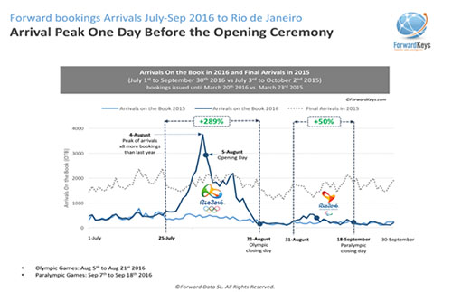 Em uma ação inédita, o Rio Convention & Visitors Bureau (Rio CVB), em parceria com a ForwardKeys, divulgou uma análise que apresenta o impacto das vendas de bilhetes aéreos realizadas, até o momento, para o Rio de Janeiro antes, durante e após as Olimpíadas.