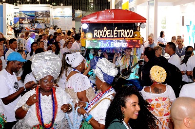 Cortejo de baianas com Rixô Elétrico e Banda Didá levou clima da folia de Salvador para a feira internacional de turismo