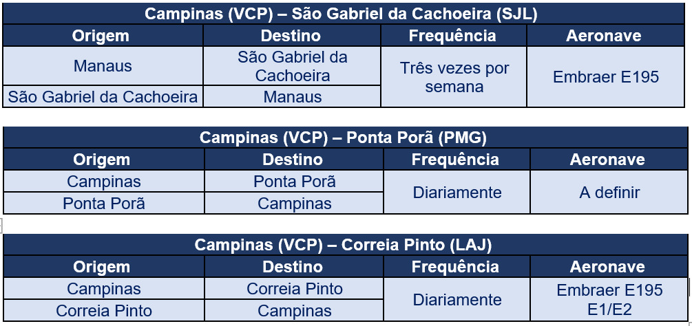Confira, a seguir, a operação planejada para os três novos destinos da Azul:
