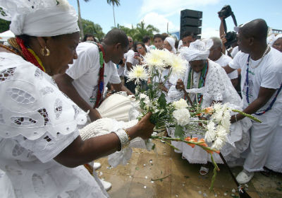 Baianas tipicamente trajadas puxam o cortejo, a partir das 8h, carregando jarros com água de cheiro