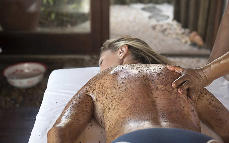 Em seguida, é realizada uma esfoliação vigorosa com uma mistura de nibs (grãos do cacau torrado e moído) e óleo de coco. Por ser muito rico em princípios ativos naturais, o cacau satisfaz as necessidades da pele e desta forma, vai recuperando o desgaste a nível celular. Segue-se um banho morno com óleo essencial de laranja doce. O ritual é concluído com o uso da sauna a vapor. O valor do tratamento é de R$360 por pessoa.