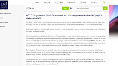 Na avaliação de David Scowsill, presidente da WTTC, a dispensa da exigência de vistos durante a Olimpíada foi um grande passo. “Nos incentivamos que o governo amplie essa política após o fim dos Jogos Olímpicos”, disse. De acordo com a WTTC, processos como acordos de isenção de vistos e programas de viajantes são essenciais para garantir a passagem segura e suave do visitante internacional.